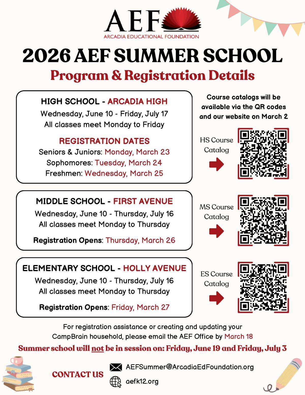 AEF Summer School Registration opens on March 26! Middle School AEF Summer classes will be from June 10-July 16. Click the QR Code for the 2026 Course Catalog.